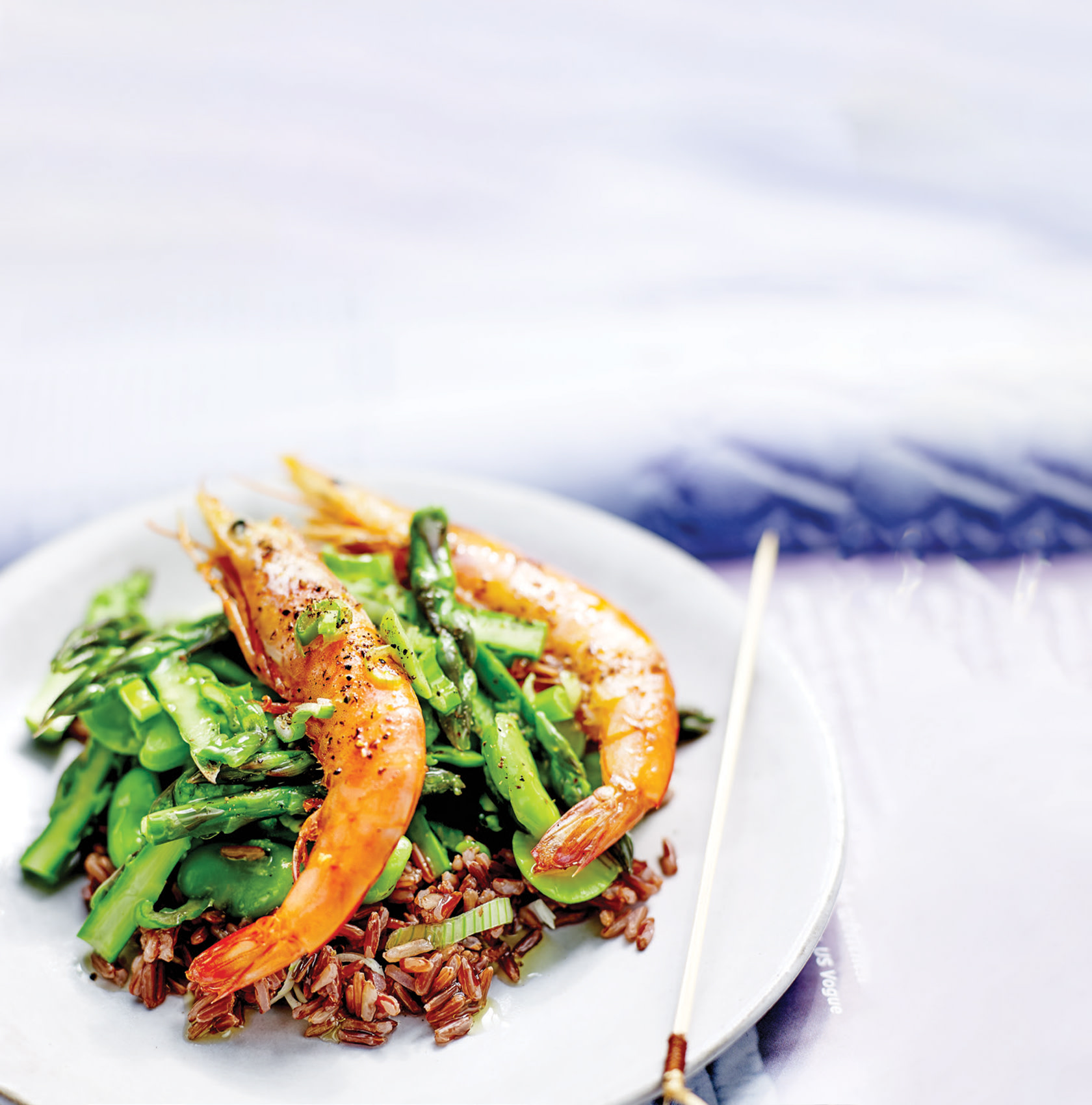 Répartissez le riz dans 4 assiettes, ajoutez les crevettes et les asperges et parsemez de fèves et d’oignon blanc ciselé.