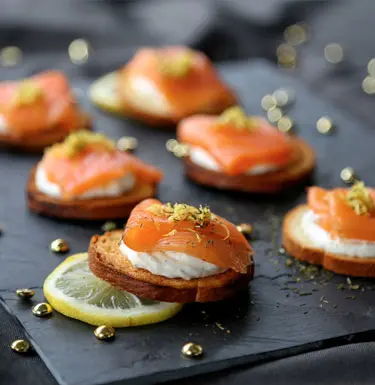 Notre sélection de saumons fumés Dom Petroff : coeur de saumon fumé au yuzu, carpaccio de saumon fumé.