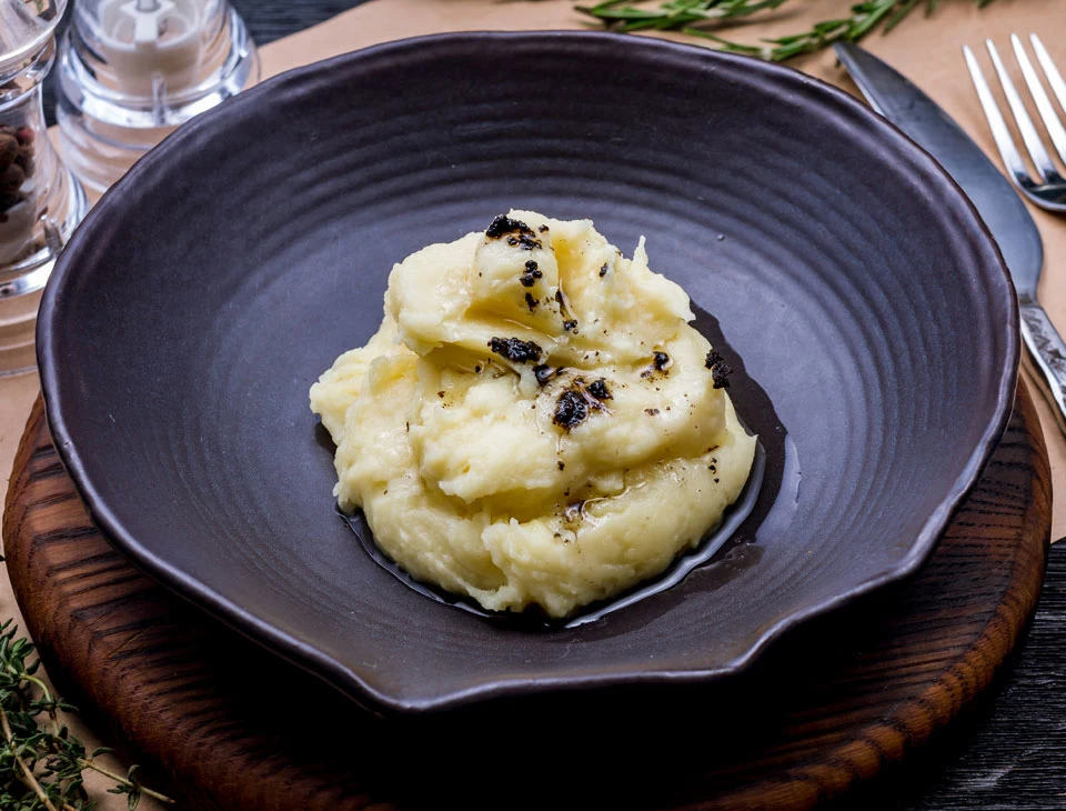 Disposez la purée dans des cassolettes ou des assiettes, ajoutez un léger filet d'huile d'olive à la truffe noire pour sublimer le tout, et servez bien chaud.