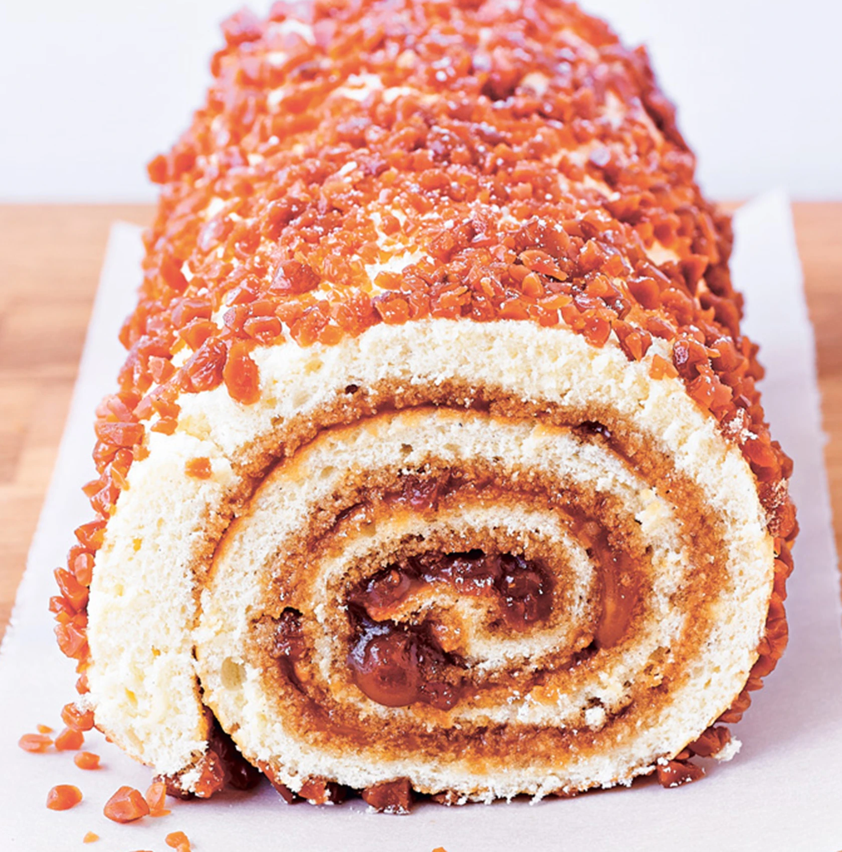 Faites rouler le gâteau dans les éclats de Salidou restants en appuyant légèrement pour les faire adhérer. Servez aussitôt.