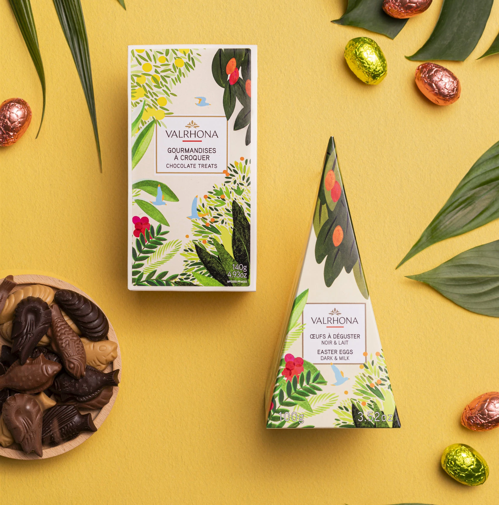Le design élégant et épuré des coffrets se pare de couleurs vives qui évoquent le végétal et une nature luxuriante, en clin d’œil à l’agroforesterie, un mode de culture soutenu par Valrhona, qui respecte les sols en mélangeant différentes essences d’arbres et qui permet aux producteurs de diversifier leurs revenus. Cette collection saisonnière saura ravir les petits comme les grands gourmands