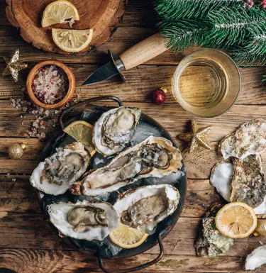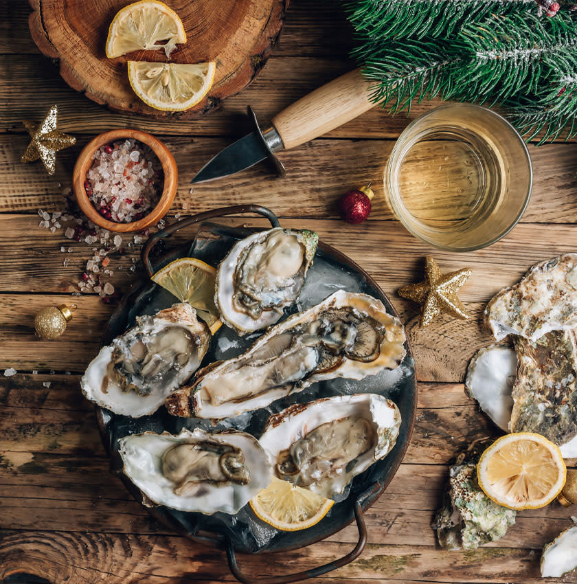 Les puristes les apprécient au naturel pour savourer pleinement leurs notes marines. Servez les huîtres bien fraîches sur un lit de glace et accompagnez-les d’un pain au seigle et d’un peu de beurre demi-sel.
