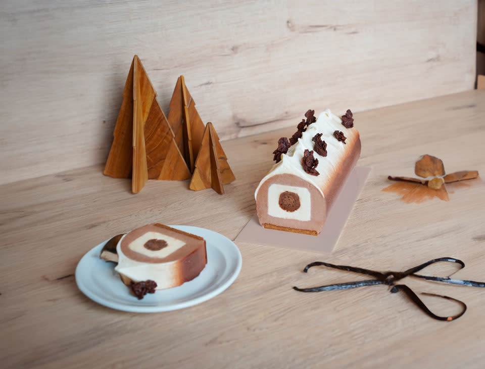 Versez la moitié de la mousse dans un moule à bûche, puis insérez l’insert vanille Tonka au centre. Recouvrez l’insert avec le reste de la mousse, en lissant bien la surface. Terminez le montage en ajoutant une couche de croustillant feuillantine sur le dessus.