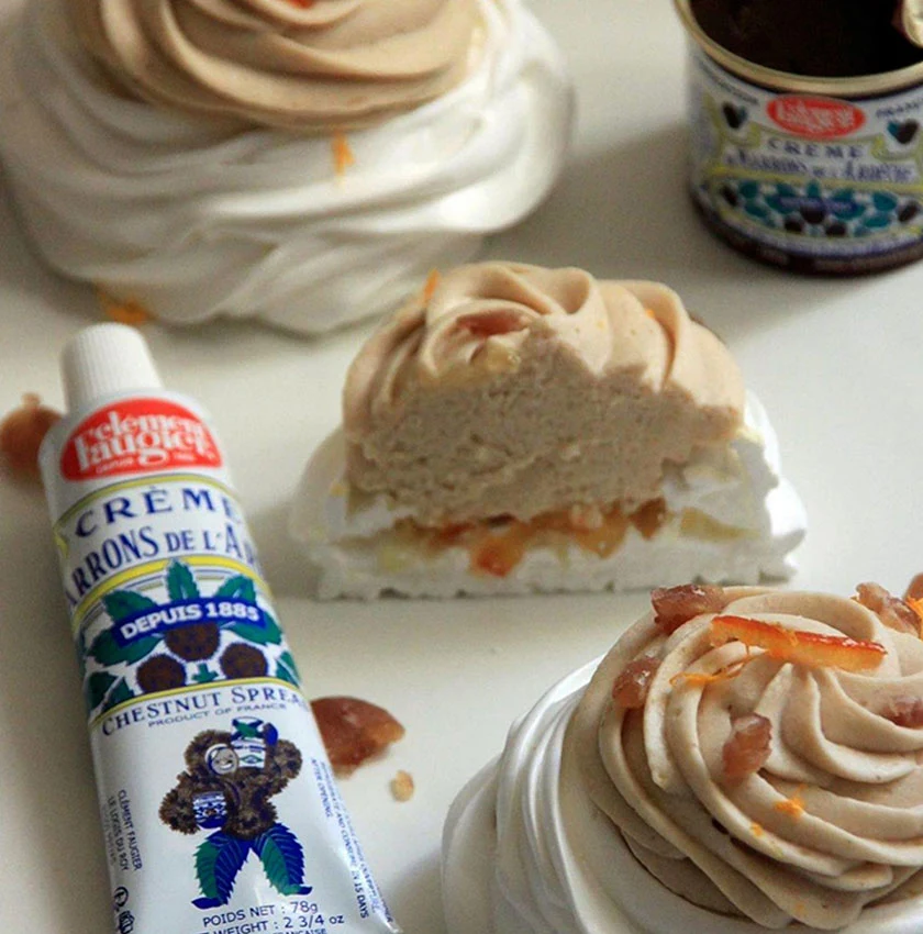 Les châtaignes se récoltent à l’automne et sont riches en glucides (ainsi qu’en minéraux, notamment le potassium). On associe donc tout naturellement la crème de marrons aux desserts réconfortants et aux douceurs des fêtes. Le Mont-Blanc est sans doute la pâtisserie la plus iconique à base de marrons : il est composé de meringue, chantilly et vermicelles de crème de marrons. On retrouve également souvent de la crème de marrons dans les recettes de bûches de Noël.