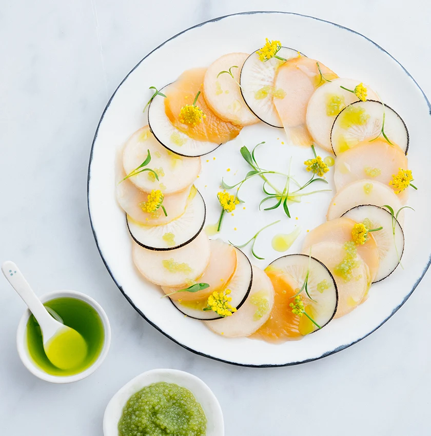 1. Dans de belles assiettes rondes, disposez les tranches en formant une grande couronne (rosace). Alternez harmonieusement une lamelle de Saint-Jacques, un disque de radis noir et une rondelle de poire.