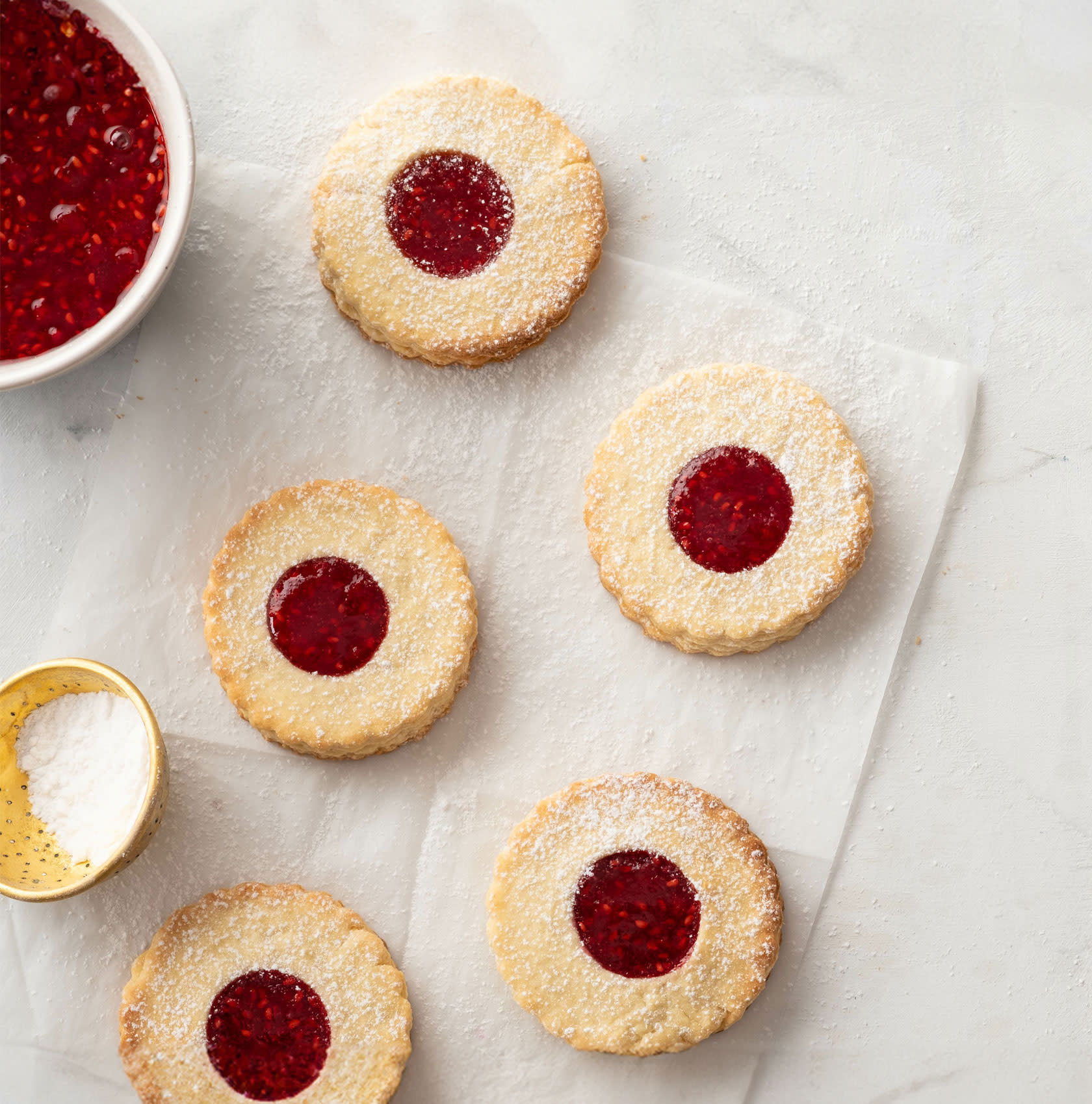 Creusez légèrement au centre de chaque sablé afin d'y verser quelques cuillères à café de confiture: framboise pour une douceur acidulée, abricot pour une touche ensoleillée, ou encore figue pour un résultat plus raffiné.