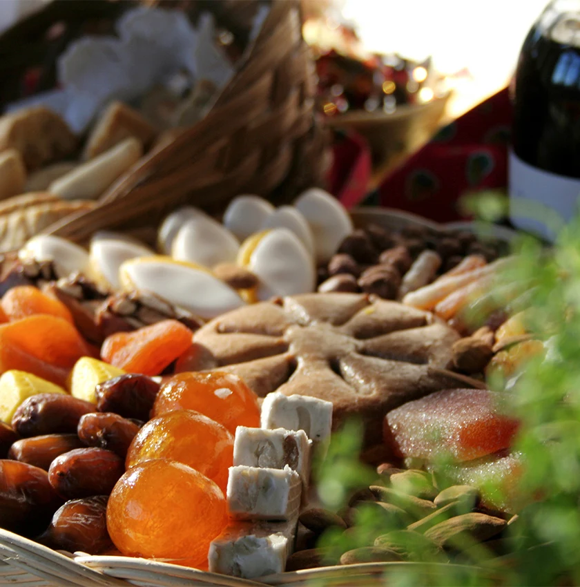 des fruits frais : du raisin et du melon vert, que les familles conservaient autrefois précieusement jusqu’à Noël, des quartiers d’orange ou de mandarine, des poires… ;