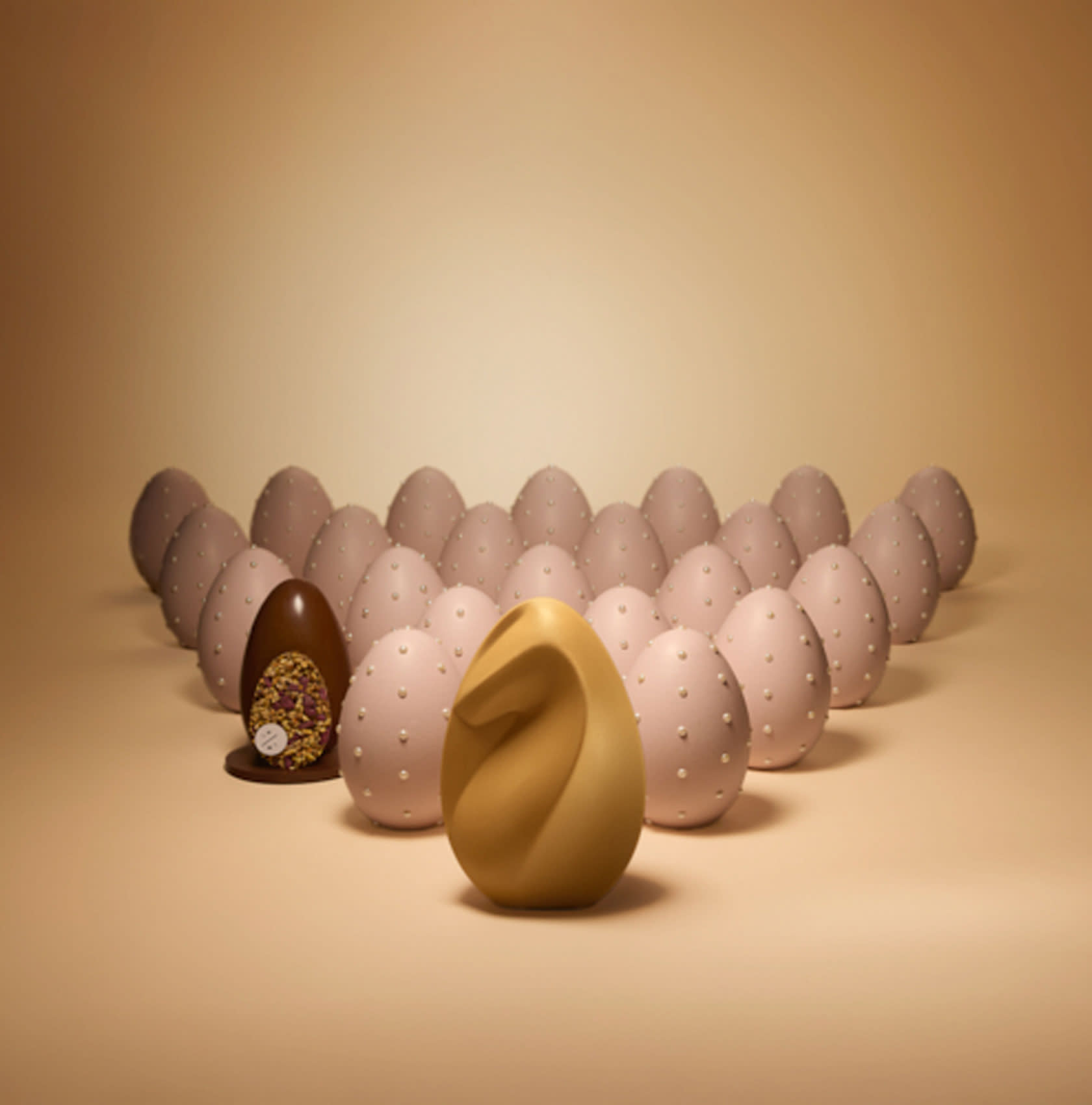 Pour sa création de Pâques, le grand chef pâtissier a choisi le chocolat blond. La silhouette épurée du cavalier, tout droit sorti d’un jeu d’échecs, fait écho à la thématique de sa collection 2025, intitulée « Pris au Jeu ». L’Œuf Cavalier Pierre Hermé Paris est composé d’une coque au chocolat blond caramélisé à la fleur de sel et renferme de délicieux petits œufs et gourmandises au chocolat.