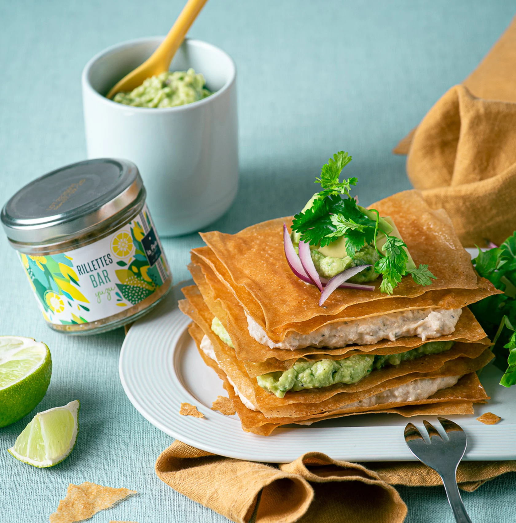 5. Passez ensuite au dressage directement sur vos assiettes de service : superposez deux carrés de brick, étalez une généreuse couche de rillettes, ajoutez deux nouveaux carrés de brick, puis une belle couche de guacamole. Poursuivez en alternant à nouveau avec deux feuilles de brick, une couche de rillettes, et terminez en recouvrant avec deux derniers carrés croustillants.