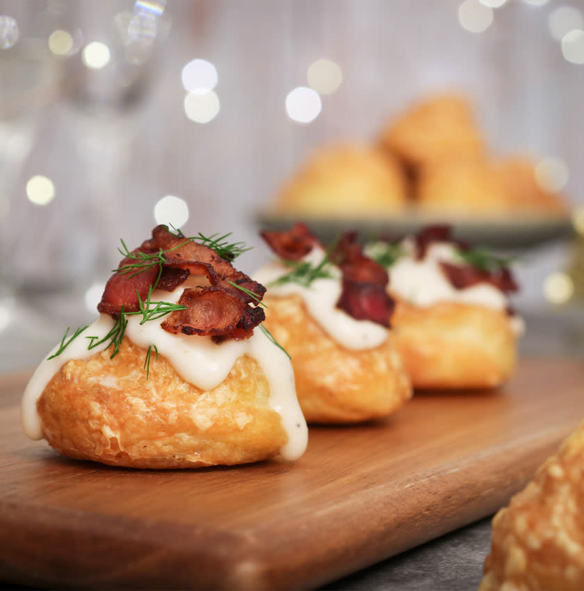 Gougère au saumon et à l’aneth : filet de saumon fumé, aneth, touche de crème fraîche.