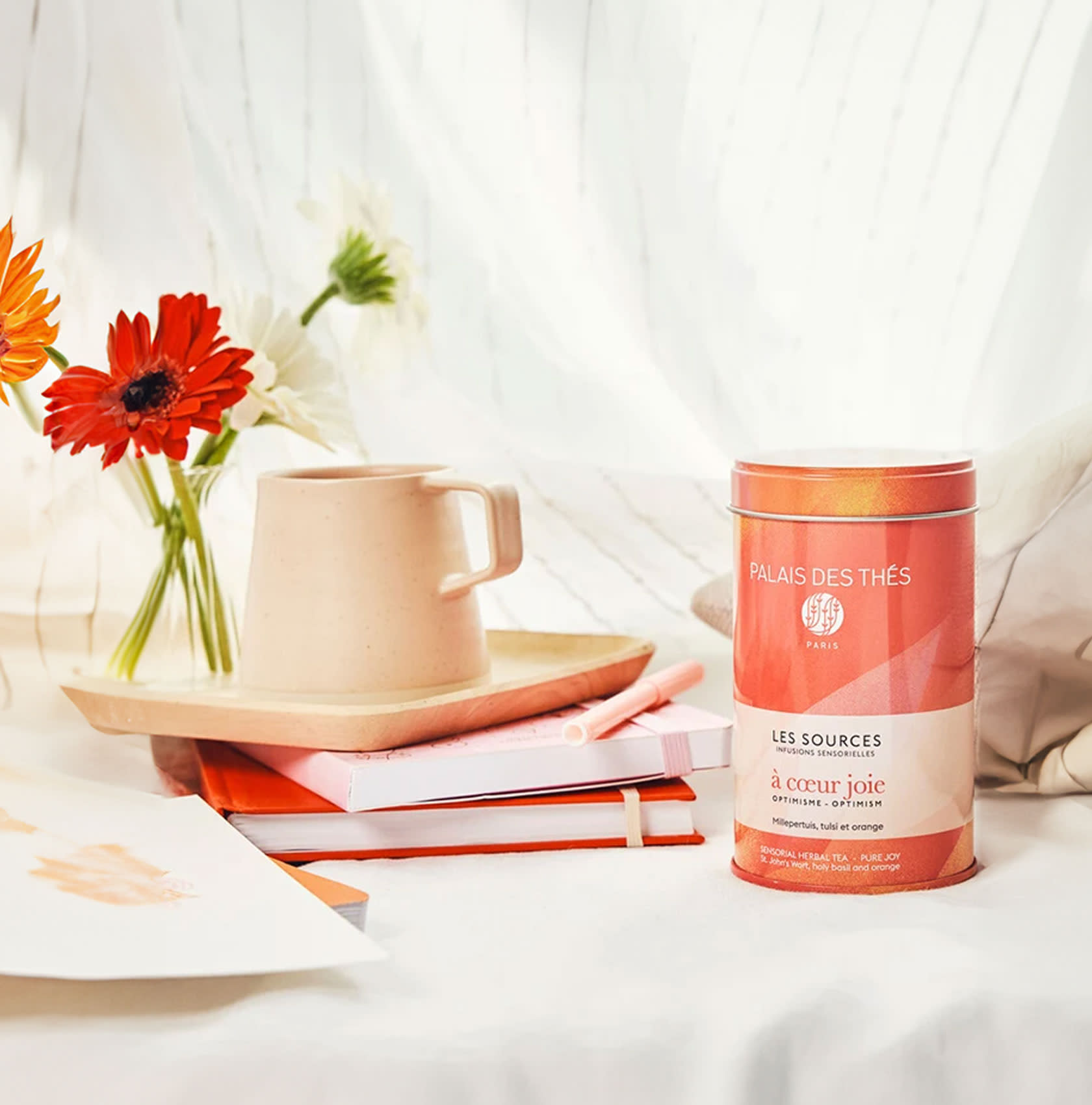 Infusions aux fruits : infusion bio « À cœur joie » Les Sources (millepertuis, tulsi, orange) pour profiter de l’instant présent, Jardin tropical Palais des Thés (mangue, ananas, papaye et pêche) pour une pause ensoleillée au cœur de l’hiver.