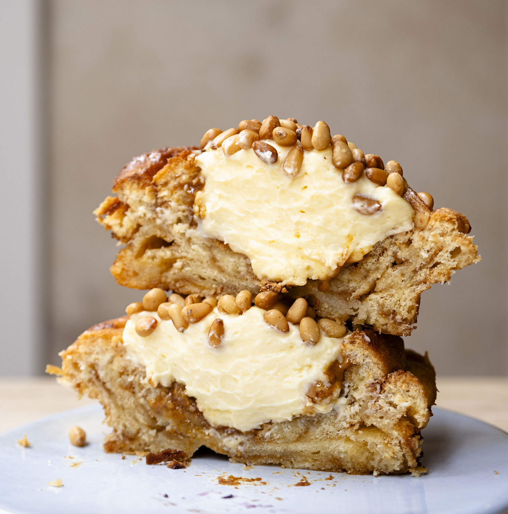 Passionné par la pâtisserie, Aurélien Cohen bifurque après des études de marketing pour en faire son métier. Le jeune chef pâtissier, suivi par plus de 280 000 becs sucrés sur Instagram, est désormais à la tête de sa propre boutique à Asnières-sur-Seine, où il propose des desserts tout en élégance et gourmandise. L’équipe de Babka Zana a eu le coup de cœur pour l’une de ses recettes phares, la tarte Fleur d’Orient, qui associe les saveurs des pignons de pin à ceux de la fleur d’oranger. Autour des mêmes accords, elle a ainsi imaginé avec le chef « la babka d’Aurélien », la première babka réalisée comme une pâtisserie : garnie d’un praliné aux pignons de pin et d’une crème à la fleur d’oranger, elle est parsemée de pignons de pin torréfiés.