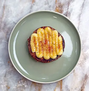 Au terme de la caramélisation, déposez les tranches de brioche dans des assiettes. Pochez délicatement la crème à la vanille en zigzag sur les tranches de brioche. Parsemez le sucre cassonade sur la crème et faites brûler à l’aide d’un chalumeau.