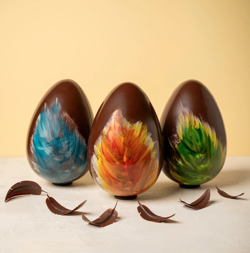 Autre variation : le joli Œuf Plume. Recouvert de chocolat noir, il arbore trois couleurs : bleu, vert et orange. Il est bien sûr garni d’Amandes Princesse. L’Œuf Plume peut se déguster seul ou en coffret, 2 tailles de coffret sont disponibles à la vente T0 et T1, chaque couleurs des œufs du coffret détient une saveur différente : bleu pour le praliné coco, vert pour le praliné pistache et orange pour le praliné noix de pécan.