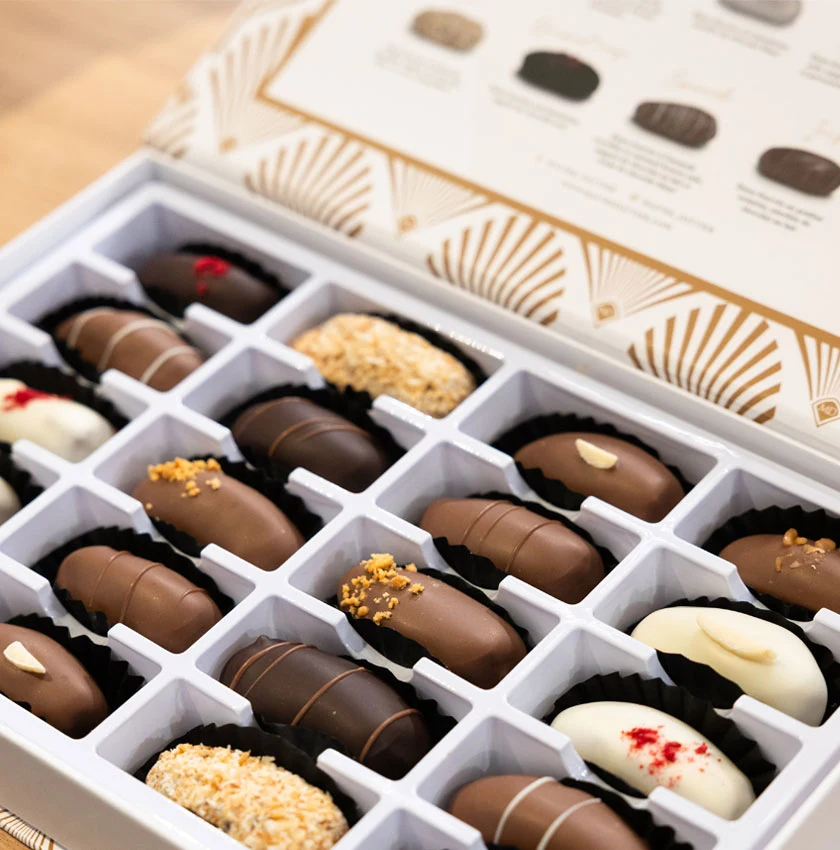 assortiments de dattes enrobées, présentées dans de jolis coffrets à offrir (5, 10 ou 20 dattes) ;