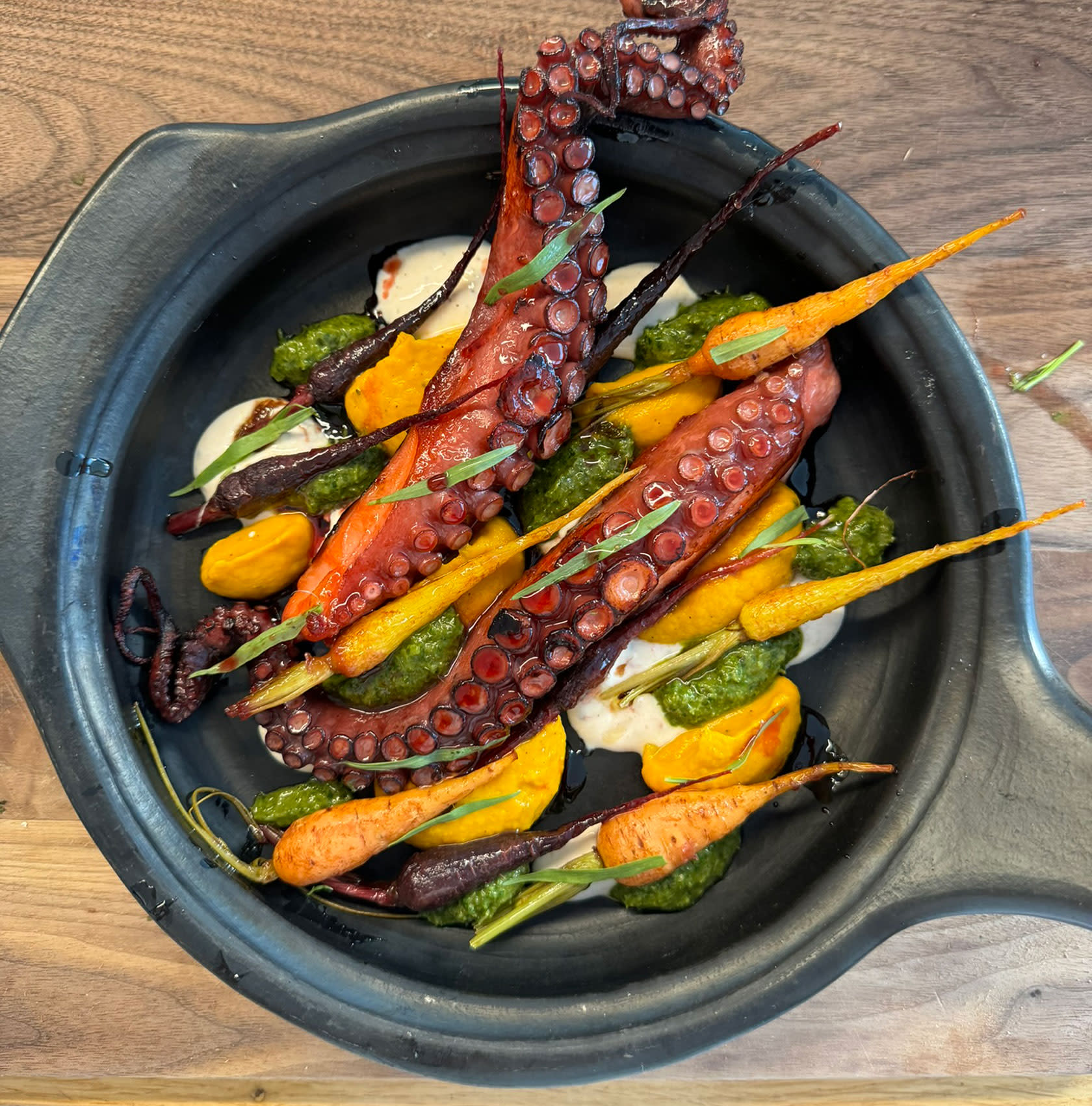 Disposez dans vos assiettes la purée de carottes, le yaourt au café. Posez par-dessus les tentacules de poulpes et la sauce verte. Ajoutez-y des carottes et la marinade à la grenade.