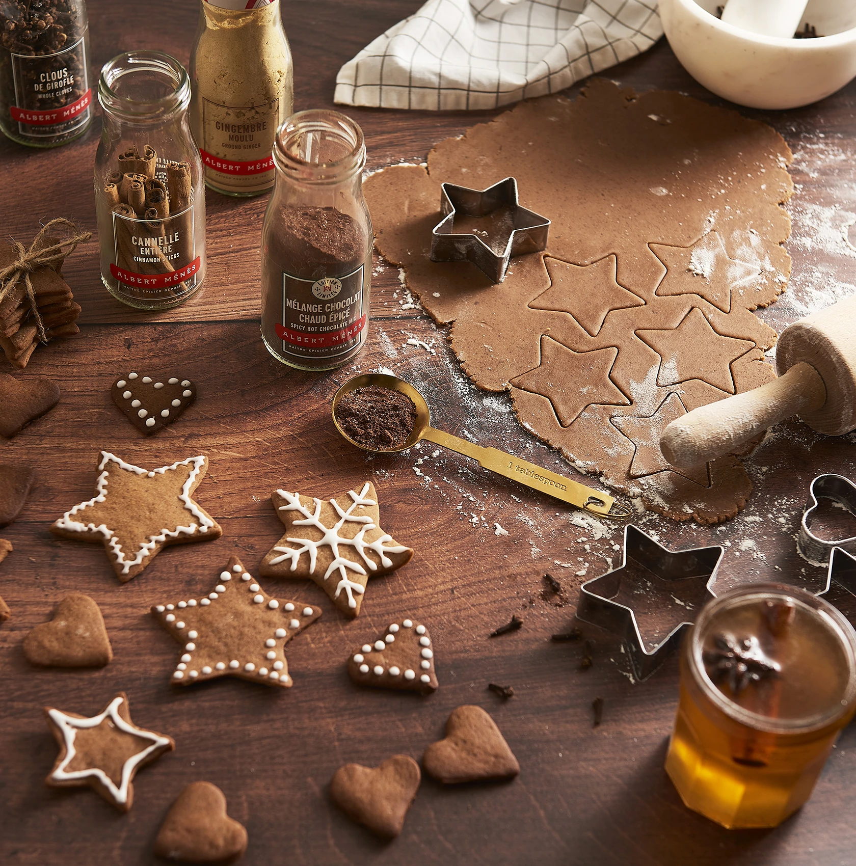 Mettez toutes les épices et le mélange chocolat chaud dans le beurre et le sucre. Ajoutez le bicarbonate de soude préalablement dissolu dans un peu d'eau. Ajoutez au mélange la farine au fur et à mesure jusqu'à obtenir une pâte qui ne colle pas trop.