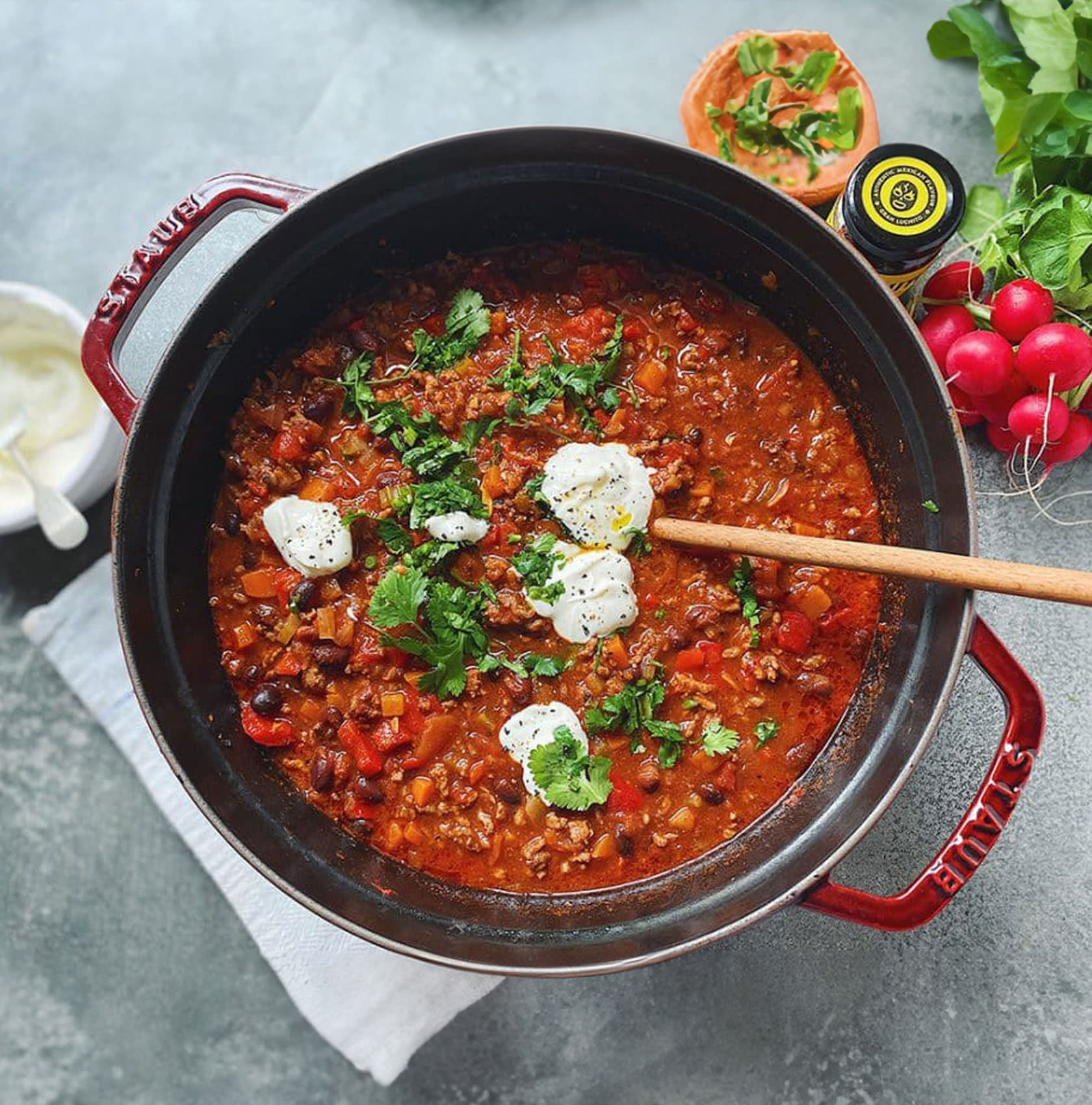 Astuce du chef : pour plus de saveur, laissez mijoter votre chili con carne pendant 1 heure. Il est conseillé de servir le chili con carne sur un lit de riz accompagné d'une cuillerée de guacamole sur le dessus.