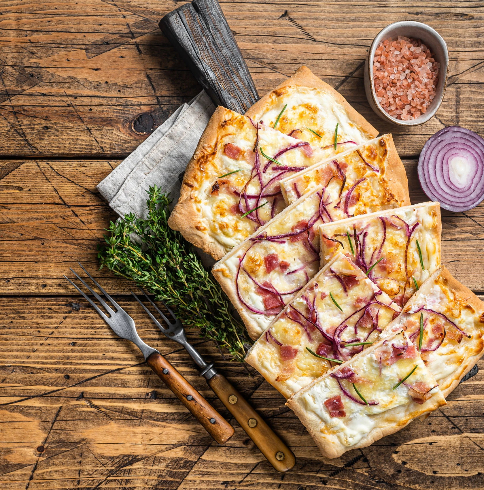 Pour commencer le repas, misez sur la savoureuse flammekueche ou tarte flambée, un incontournable de la gastronomie alsacienne. Dans sa version classique, elle est recouverte de fromage blanc (ou crème fraîche), oignons et lardons. Dans les campagnes, elle était traditionnellement cuite dans les fours à pain, chauffés au feu de bois. Un délice qu’on a même le droit de déguster avec les doigts ! Autre option pour l’entrée, un bel assortiment de charcuteries alsaciennes, accompagnées de pain aux céréales : saucisse à la pistache ou saucisse au jambon d’Alsace, lard paysan fumé, pâté en croûte, saucisses de Strasbourg (les célèbres knacks). La dégustation peut être complétée avec un presskopf ou du foie gras d’oie pour les amateurs.